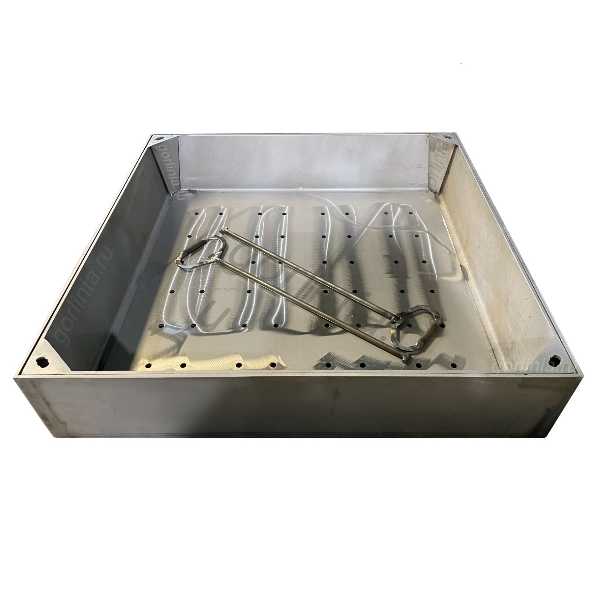 Изделие изготовлено из листовой стали AISI 304 5мм с применением лазерной резки, гибки на прессовом оборудовании и сварки. Снизу в дне вырезаны дренажные отверстия D10 с шагом 70-100 мм, чтобы травяной покров не всплывал при поливе и осадках.