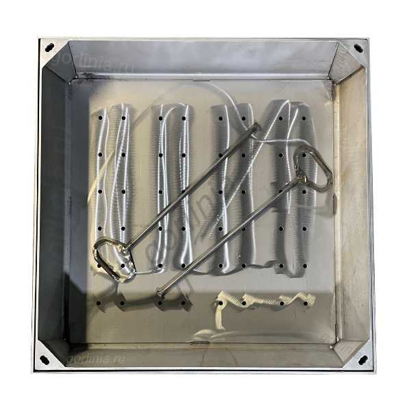Крышку вынимают специальными крюками с т-образными наконечниками через отверстия по углам. Закажите исполнение с крепежными ушами (пластинами) для удобства монтажа и выставления в уровень земли. Усиление каркаса корыта профилем является доп. опцией (см. фотогалерею)