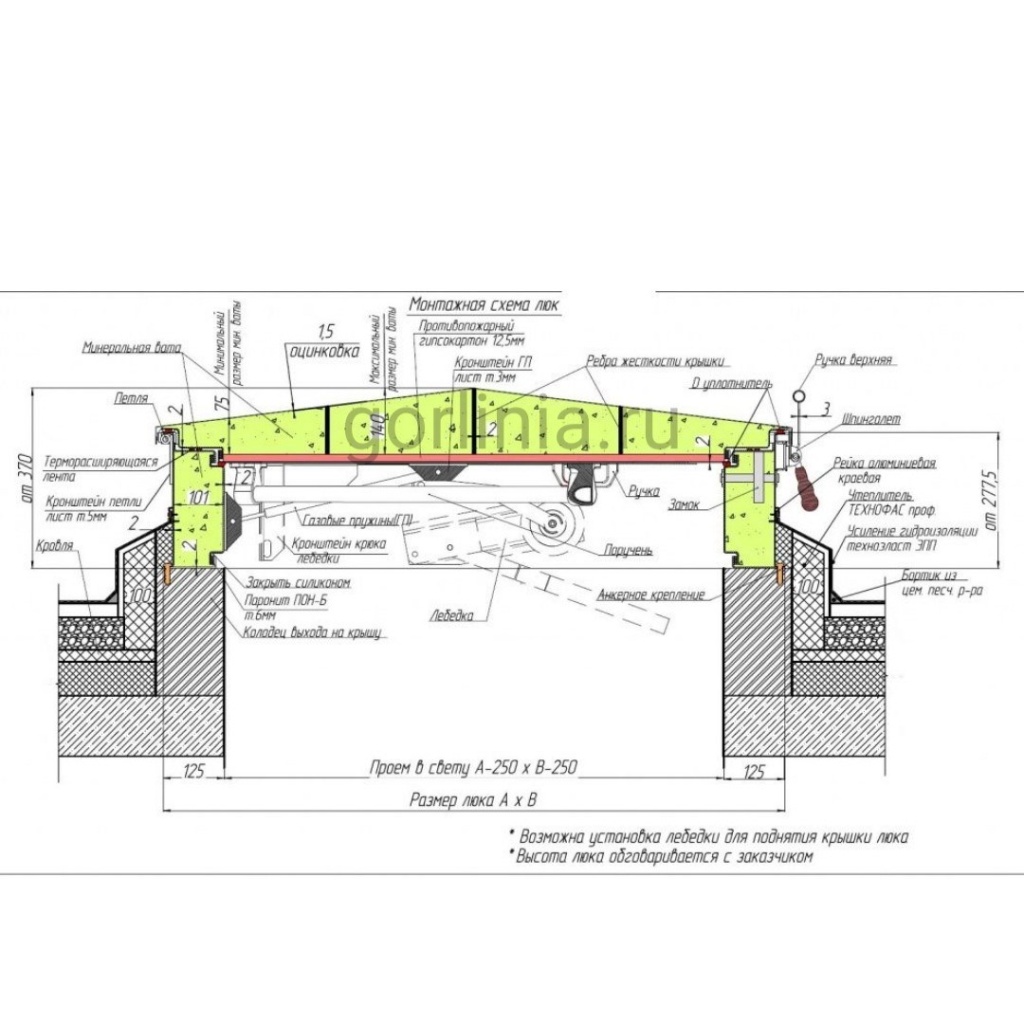 Подъемный механизм на шарнирах с газовыми пружинами для снятия нагрузки при подъеме крышки и плавного хода при опускании в створ. Система запирания на врезной замок с поворотными ригелями и двухсторонней личинкой. Снаружи опорно-укрывной элемент дополнительно закрывается на задвижку во время нахождения на кровле.