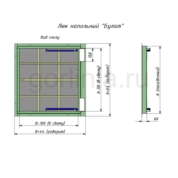 Конструкция смещенного за ось открывания узла шарнира позволяет изготовителю сформировать опорную поверхность по стороне петли 800, сохранив при этом ширину лаза 800 для устройства лаза в погреб с приставной лестницей.